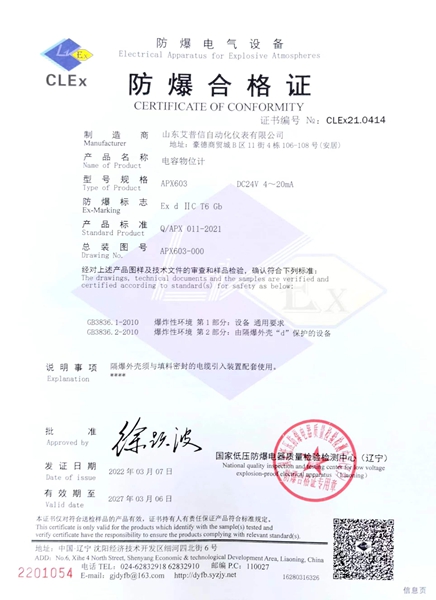 標(biāo)準(zhǔn)款音叉物位開關(guān),優(yōu)質(zhì)防爆鑄造鋁殼,不銹鋼銘牌,sus316叉體材質(zhì)。 型號(hào):APXYC504 應(yīng)用:液體/粉體 供電:24VDC/220AC 輸出:繼電器(DPDT) 連接過程:G1''螺紋 叉體長(zhǎng)度:100mm 介質(zhì)溫度:-30℃-80℃ 壓力:≤4MPa 防爆等級(jí):Exd IIC T6 Gb 防護(hù)等級(jí):IP65